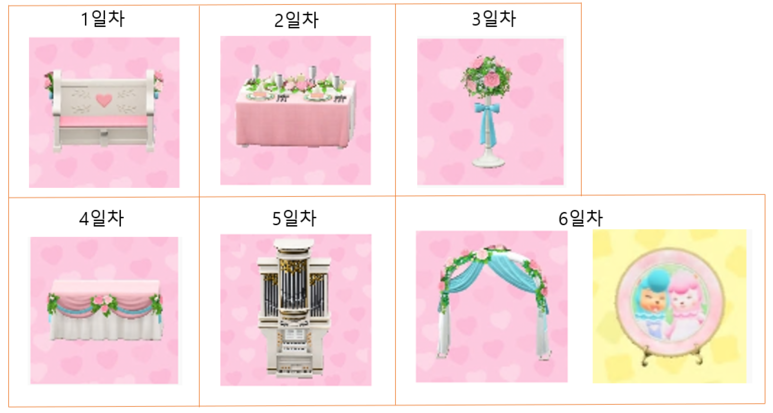 날짜별로 받을 수 있는 가구가 다릅니다. 이벤트가 끝나면 얻을 수 없습니다. 카탈로그 주문도 안되기 때문에 이벤트 기간에 받아야 합니다. 사진 촬영후에 꼭 말을 걸어 한정가구와 사랑의 결정을 받기를 바랍니다.